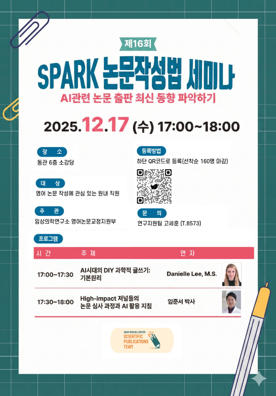 SPARK 논문작성법 세미나 공지합니다. 논문작성법 특강은 의과학과 자체 졸업요건이므로 대학원생들의 많은 참석 바랍니다. ※ 제16회 SPARK 논문작성법 세미나 ※ 1. 제목 : AI관련 논문 출판 최신 동향 파악하기 2. 일시 : 2025년 12월 17일 수요일 17:00~18:00 3. 장소 : 동관 6층 소강당 4. 등록링크 : https://forms.gle/v8J27Geb7r1FiHvW8