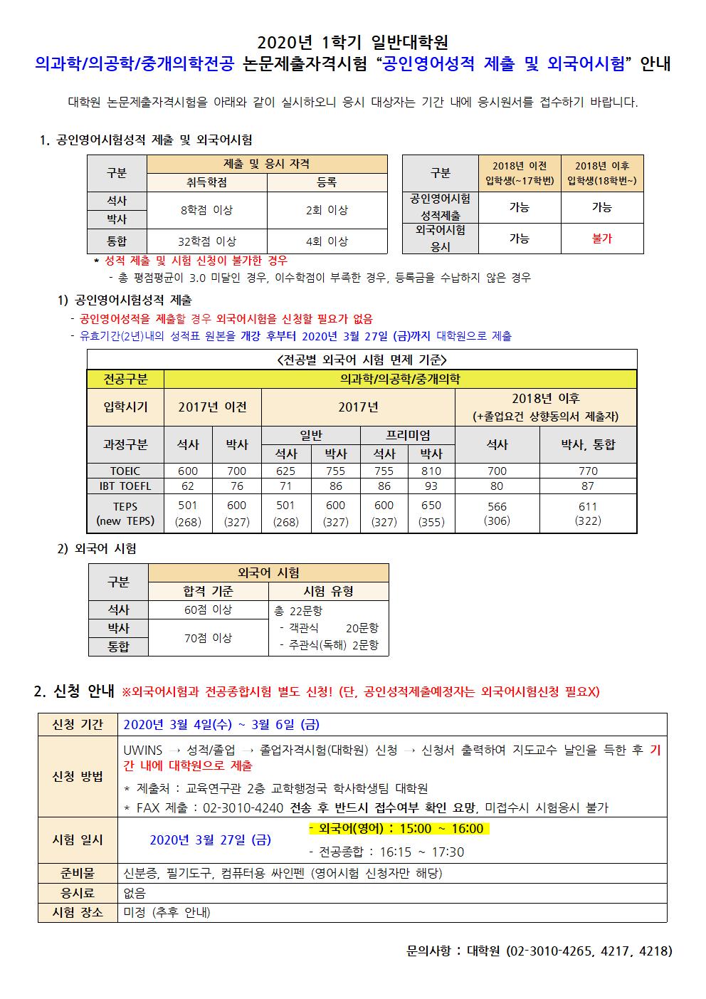 | 2020-1학기 의과학/의공학/중개의학 전공 논문제출자격시험(공인영어성적제출 및 외국어시험) 안내 |